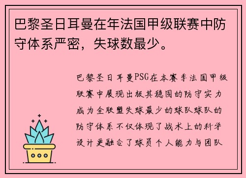 巴黎圣日耳曼在本赛季法国甲级联赛中展现出的防守体系严密和失球数最少的成就,是多方面因素共同作用的结果。科学的防守阵型设计、卓越的球员技术与身体素质、完善的团队协防机制以及教练组的精准战术指导,共同构建了这道坚不可摧的防线。